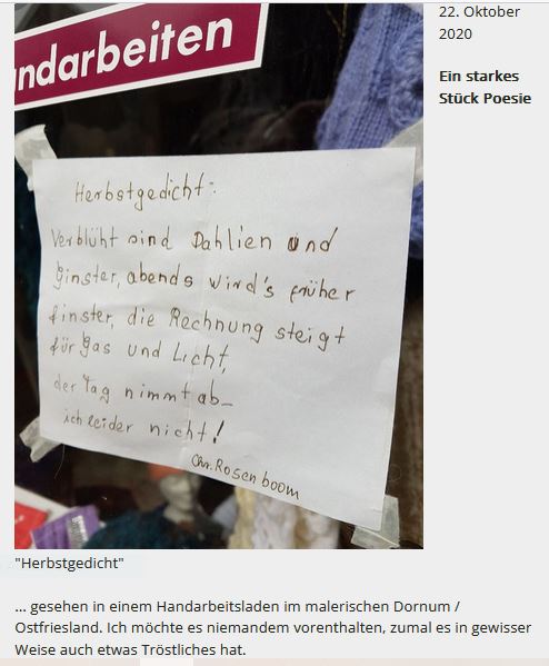 Nein, nein - ich möchte es der Welt auch in diesem Jahr nicht vorenthalten: Dies starke, dies ungemein lebensnahe Stück Poesie ...