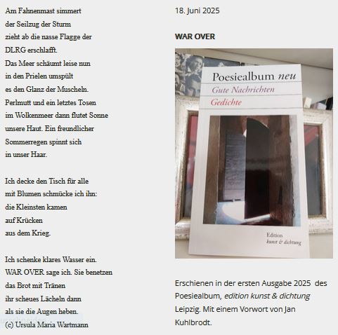 Der erschütternde Besuch des Flandernbunkers in Kiel hat mich vor einem Jahr zu diesem Gedicht animiert. Es wird in Kürze veröffentlicht werden. Ursula Maria Wartmann: Bleichwiesen. Verlag der 9 Reiche, Berlin. (siehe unten, 8. September).
