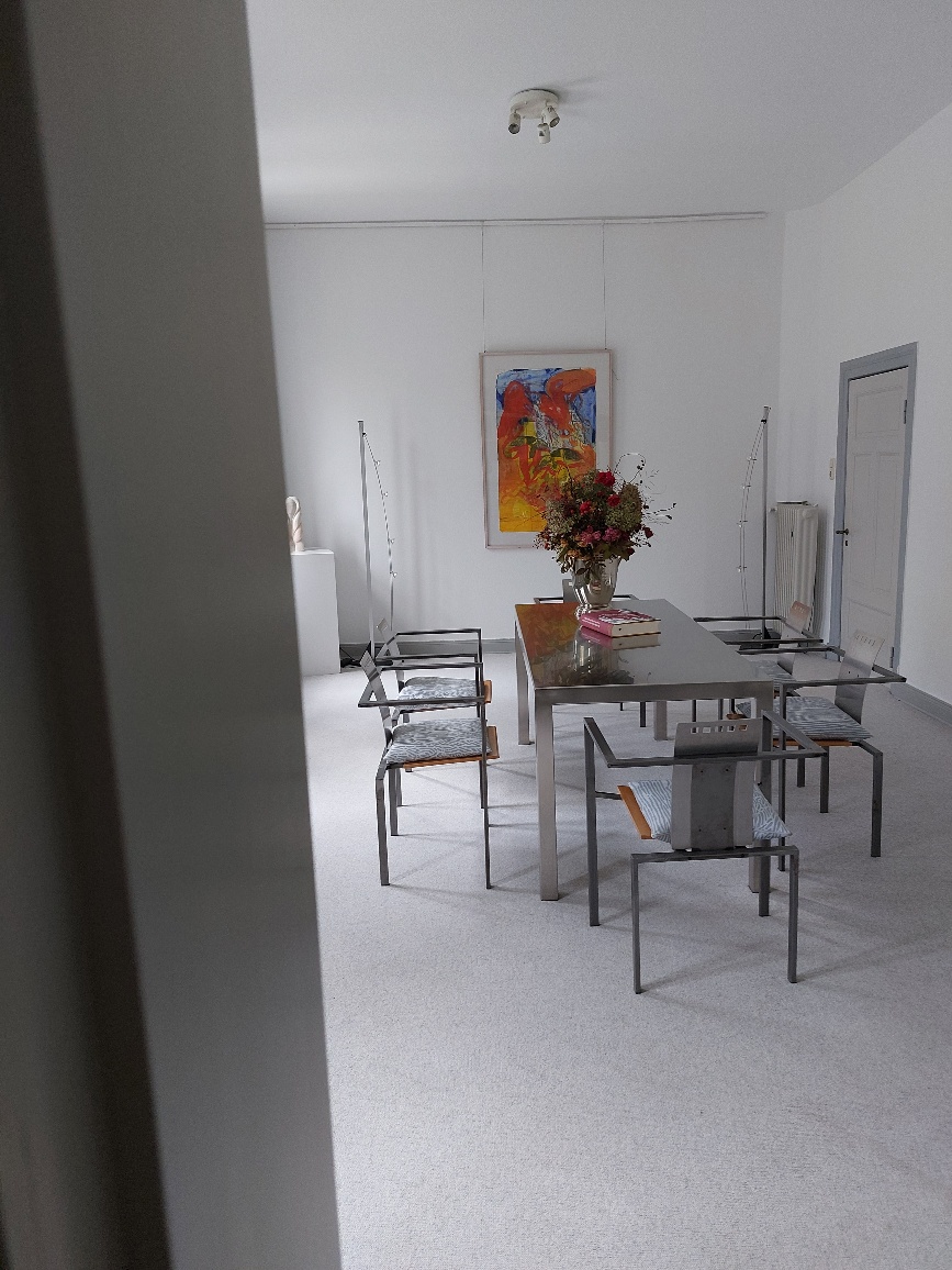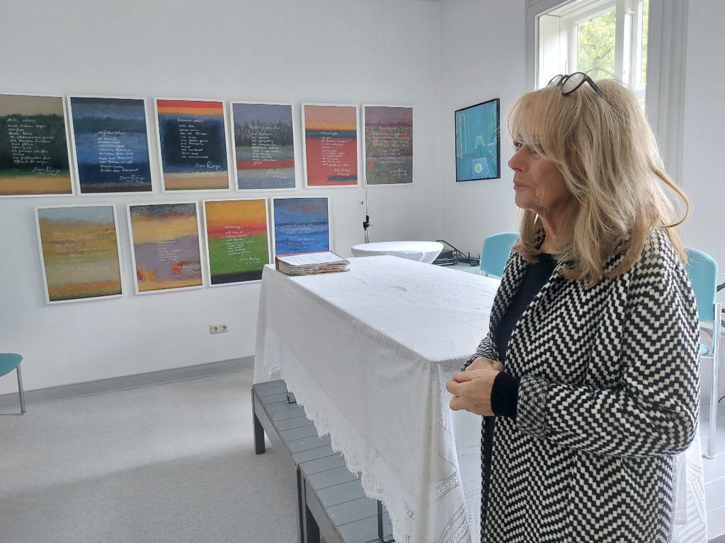 Im Atelier von Dorothee Jöllenbeck hatte ich ein Buch Runges gekauft - in Schallgeschwindigkeit hatte Jöllenbeck einen Signier-Termin bei Runge im Weißen Haus klargemacht; welch eine schöne Überraschung. So konnten wir Einblick in dessen atemberaubende Ästetik bekommen. Doris Runge hatte, obwohl einen Stock höher Besuch von ihr saß, ein paar Minuten Zeit für uns - und für Gespräche über Lyrik, die, obwohl nur kurz aber intensiv, mich sofort glücklich machten. Und sie, glaube ich, auch. Und wieder eine kleine große Kostbarkeit im Fluss des Lebens ... Vielen Dank auch noch einmal von hier an Doris Runge und Dorothea Jöllenbeck.