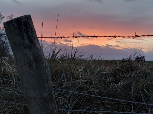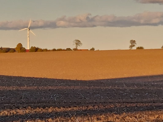 An der kleinen Steilküste in Süßau steht die Sonne schon tief. Ein paar hundert Meter weiter im Hinterland setzt sie die Wipfel der Bäume und Ackerfurchen schon in Brand und wirft lange Schatten.
