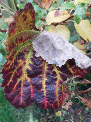 In den Gärten, wie hier bei einer Freundin im Wiesengrund unten an der Emscher, vollendet die Natur ihr Werk. Einzig die Rose leuchtet noch frisch im Braun und Grün und Dunkel ... Ein Goldener Oktober scheint in diesem Jahr nicht mehr vorbei zu schauen.