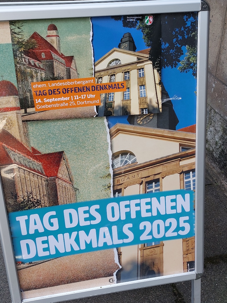 Im repräsentativen Oberbergamt im Kaiserstraßenviertel mit vielen prächtigen Häusern wurde in diesem Jahr der Tag des Denkmals in Dortmund eröffnet. Von hier aus wurde über hundert Jahre lang alles rund um den Kohlebergbau (und später den Rückbau) organisiert. Die geladenen Gäste lauschten hochkarätigen Vorträgen und einer kleinen Blaskapelle, labten sich später an Bier & Büffet und kamen miteinander munter ins Gespräch. Und alle - alle! - sangen das Steigerlied. So sind sie, die Ruhris. Gänsehaut!